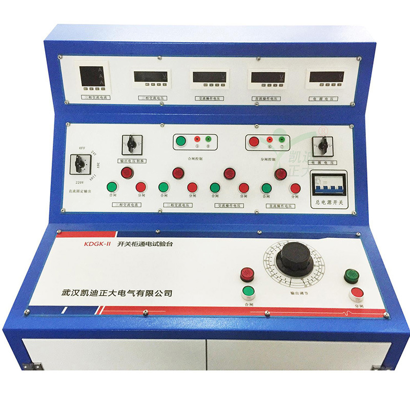 KDGK-II高低壓開關柜通電試驗臺用于高低壓開關柜生產廠家對所生產的高低壓開關柜進行出廠前的各項通電試驗。它能提供各種交、直流電源,便于對開關柜的檢測,提高工作效率。