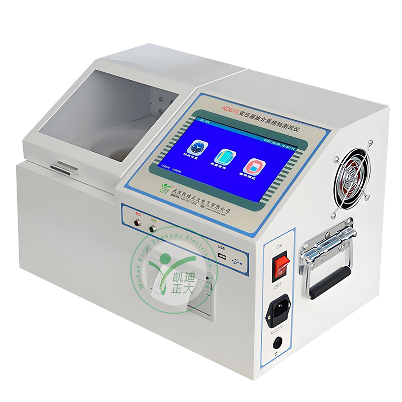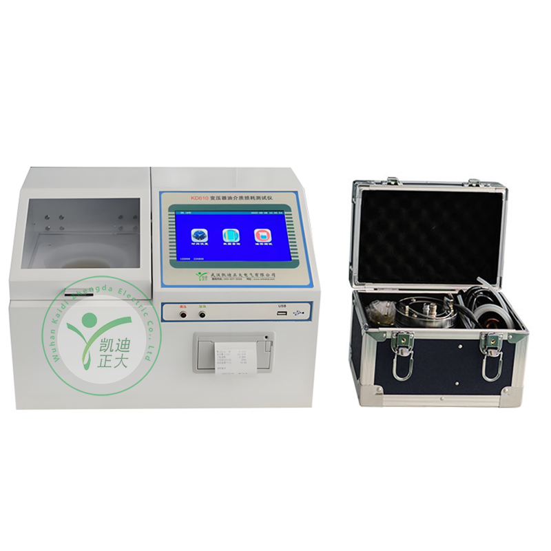 KD610絕緣油介質損耗測試儀是用于絕緣油等液體絕緣介質的介質損耗角及體積電阻率測試的一體化結構的高精密儀器。內部集成了介損油杯、溫控儀、溫度傳感器、介損測試電橋、交流試驗電源、標準電容器、高阻計、直流高壓源等主要部件。其中加熱部分采用了高頻感應加熱方式,該加熱方式具備油杯與加熱體非接觸、加熱均勻、速度快、控制方便等優點。交流試驗電源采用AC-DC-AC轉換方式,有效避免市電電壓及頻率波動對介損測試準確性影響,即便是發電機發電,該儀器也能正確運行。內部標準電容器為SF6充氣三極式電容,該電容的介損及電容量不受環境溫度、濕度等影響,保證儀器長時間使用后仍然精度一致。