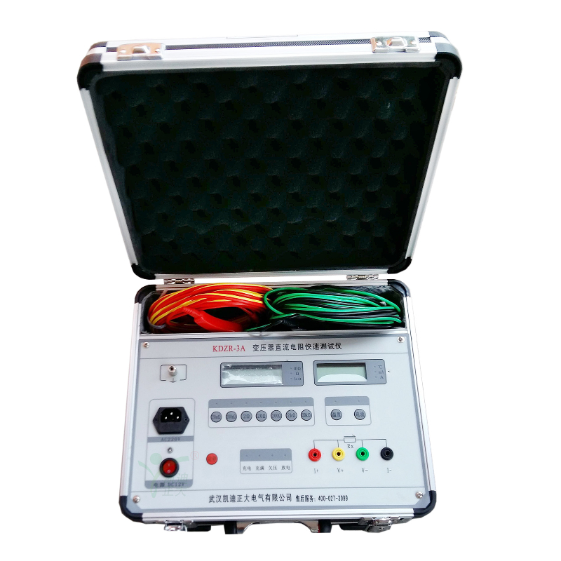 KDZR-3A直流電阻測試儀(微歐計)是取代直流單、雙臂電橋的高精度換代產品。儀器采用了先進的開關電源技術,由四位半LCD液晶顯示測量結果。克服了其它同類產品由LED顯示值在陽光下不便讀數的缺點,同時具備了自動消弧功能。本儀器具有測速快、精度高、顯示直觀、抗干擾能力強、體積小、耗電省、測試數據穩定可靠、不受人為因素影響等優點。是測量電力變壓器及大型電機等各種感性負載電阻及低壓開關接觸電阻、電線電纜或焊縫接口電阻的理想儀器,其測量速度比電橋快一百多倍。儀器內裝可充電電池組(12V),交、直流兩用,便于現場及野外測試。