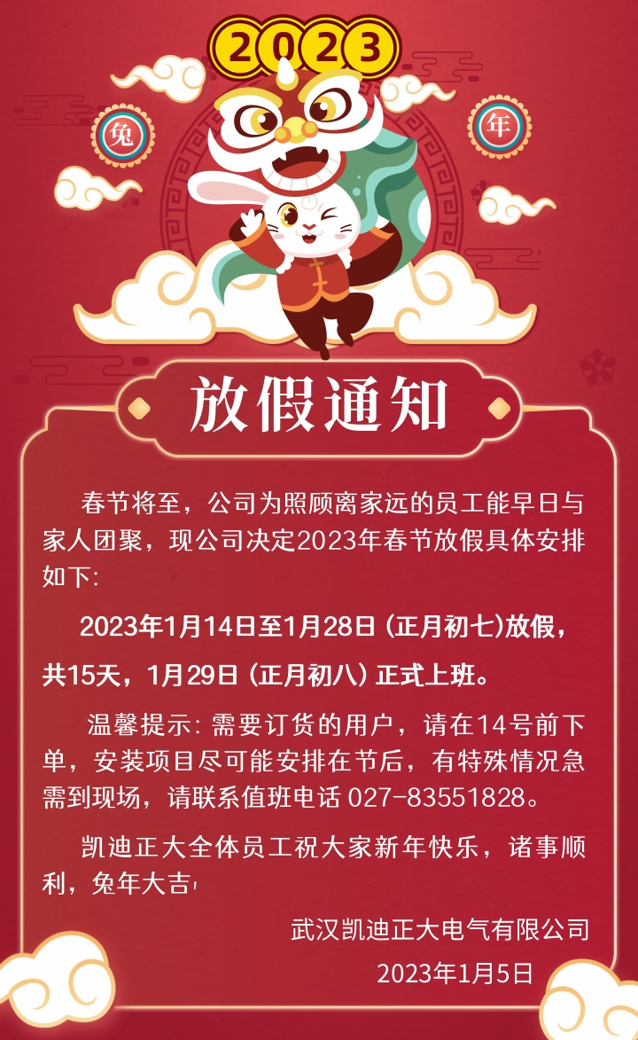 ?2023年春節(jié)將至,為使公司和員工共同度過一個歡樂、祥和、平安的新春佳節(jié),切實做好節(jié)日期間的安全工作,現(xiàn)將有關(guān)事宜通知如下: