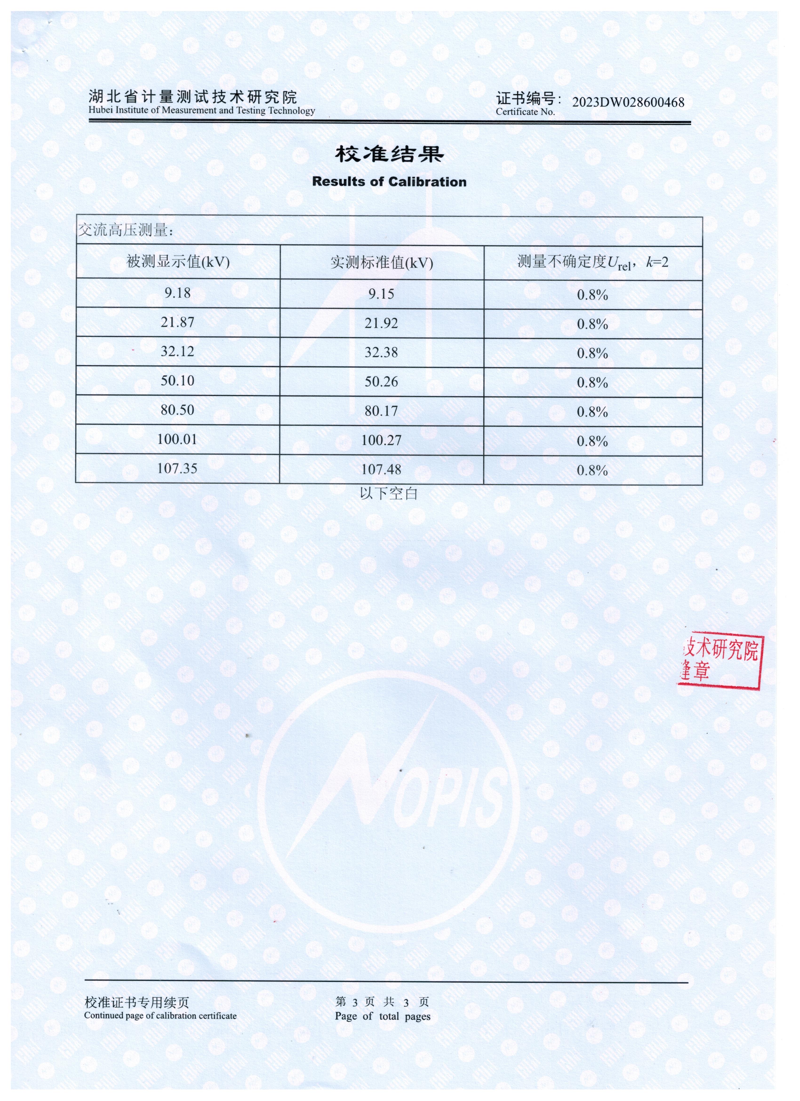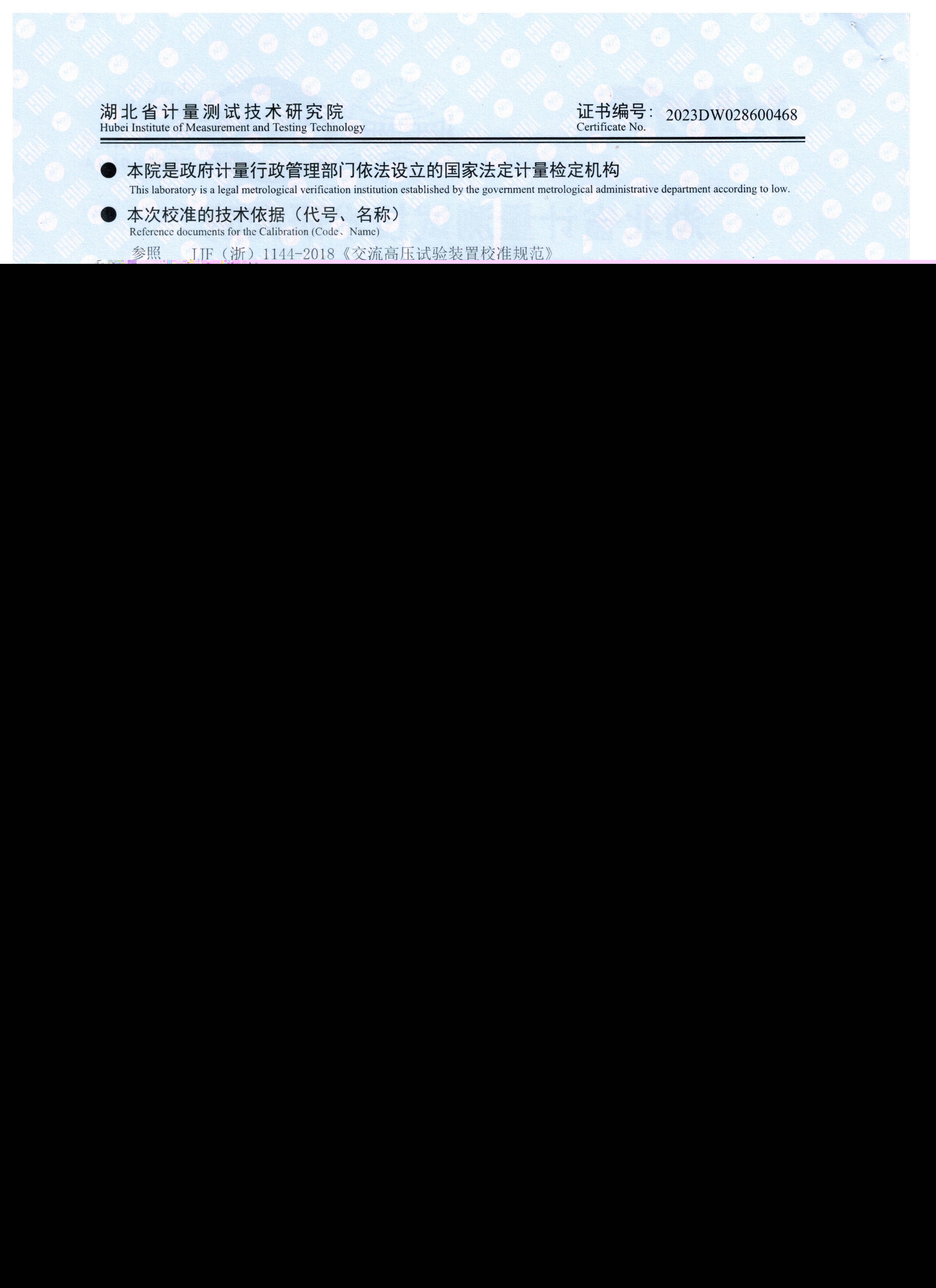 參照 JJG(浙)1144-2018《交流高壓試驗(yàn)裝置校準(zhǔn)規(guī)范》 檢定要求,KDXZ-II-108kVA/108kV 變頻串聯(lián)諧振試驗(yàn)裝置獲得2023DW028600468檢定證書。